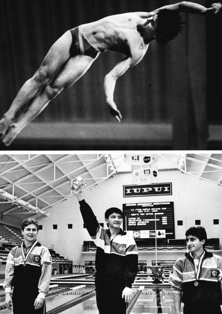 1989年5月7日,中國選手熊倪奪得第六屆世界杯跳水賽男子十米跳臺跳水冠軍。上圖是他在比賽中,下圖是他在領(lǐng)獎臺上。新華社記者 韓居策 攝
