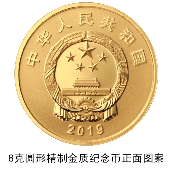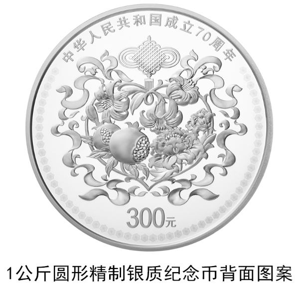 央行介紹,金質(zhì)紀念幣和銀質(zhì)紀念幣正面圖案均為中華人民共和國國徽,并刊國名、年號。金質(zhì)紀念幣有150克圓形和8克圓形兩種,其中150克圓形金質(zhì)紀念幣背面圖案為寓意民族團結(jié)同心,普天歡頌國慶的組合圖案,最大發(fā)行量2000枚。銀質(zhì)紀念幣有300元、50元、10元三種面額。該套金銀紀念幣由中國金幣總公司總經(jīng)銷。
