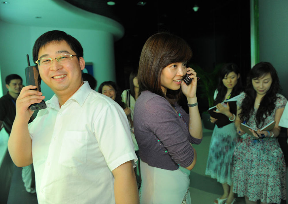 身穿喇叭褲,手持大哥大