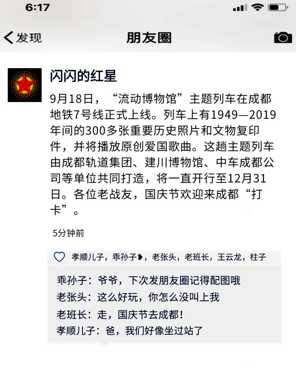 我: 爺爺,手機(jī)上有朋友圈,可以看到你的戰(zhàn)友們的動(dòng)態(tài)