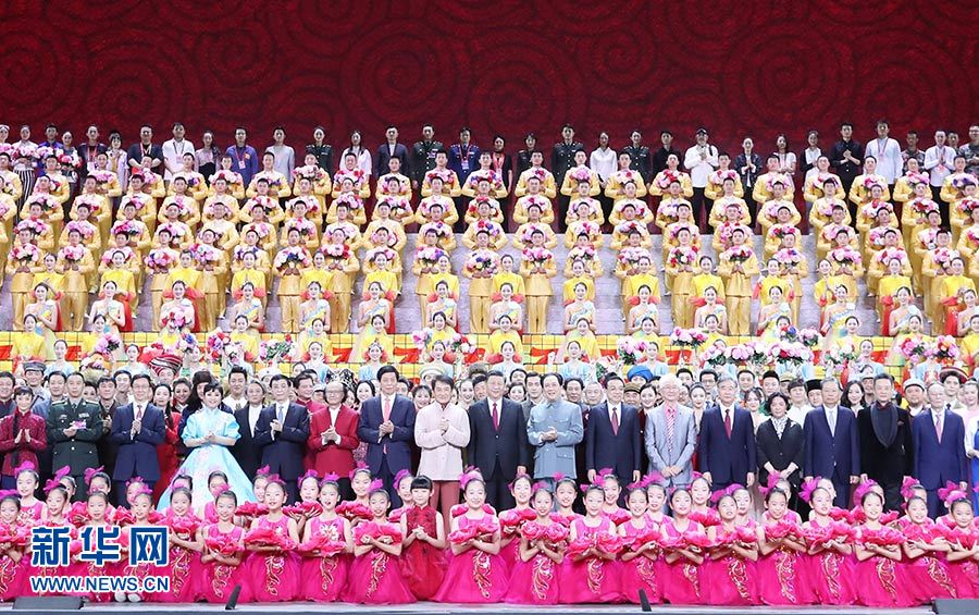 9月29日,慶祝中華人民共和國成立70周年大型文藝晚會《奮斗吧 中華兒女》在北京人民大會堂舉行。習近平、李克強、栗戰(zhàn)書、汪洋、王滬寧、趙樂際、韓正、王岐山等黨和國家領導人同4000多名觀眾一起觀看演出。演出結束后,習近平等走上舞臺同演職人員合影留念。 新華社記者 王曄 攝