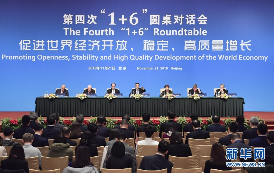 11月21日,國(guó)務(wù)院總理李克強(qiáng)在北京釣魚臺(tái)國(guó)賓館同世界銀行行長(zhǎng)馬爾帕斯、國(guó)際貨幣基金組織總裁格奧爾基耶娃、世界貿(mào)易組織副總干事沃爾夫、國(guó)際勞工組織總干事賴德、經(jīng)濟(jì)合作與發(fā)展組織秘書長(zhǎng)古里亞和金融穩(wěn)定理事會(huì)主席夸爾斯舉行第四次“1+6”圓桌對(duì)話會(huì)后共同會(huì)見(jiàn)記者。 新華社記者 岳月偉 攝
