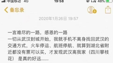 “經(jīng)歷約1872公里的我已平安到達武漢,這一路我遇見了很多可愛的人,列車長、車站工作人員……他們都在為武漢打氣加油,人間自有真情在!”1月26日,白衣天使郎冰凝在自己的手機里敲出了一段動人的文字,文字的背后是鐵路人傾情護送她奔赴武漢的暖心故事。
