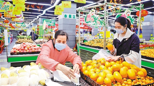 2月10日,市民在江西省宜豐縣華聯(lián)超市選購水果。連日來,該縣加強(qiáng)物資統(tǒng)籌調(diào)配,確保物價(jià)穩(wěn)定。 何賤來攝(中經(jīng)視覺)