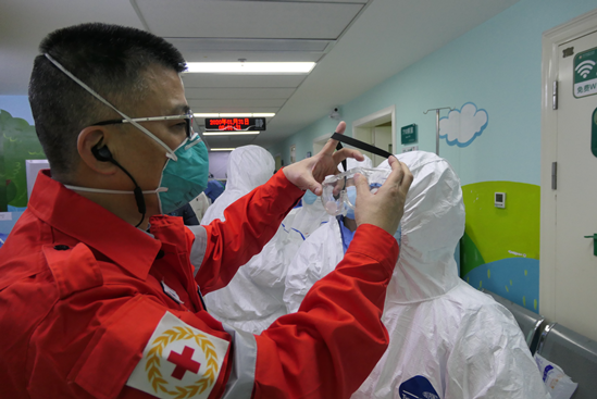 陳爾真幫助檢查隊員上班前穿戴隔離裝備 (拍攝者:隊員施偉雄)
