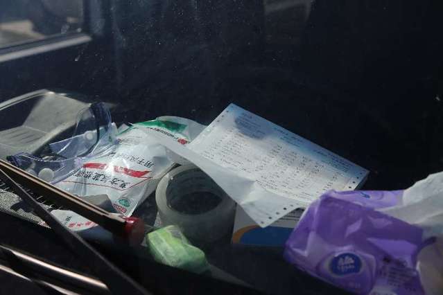 2月16日,湖北省武漢市,許可送菜車(chē)車(chē)窗旁的物品。中青報(bào)·中青網(wǎng)記者 趙迪攝
