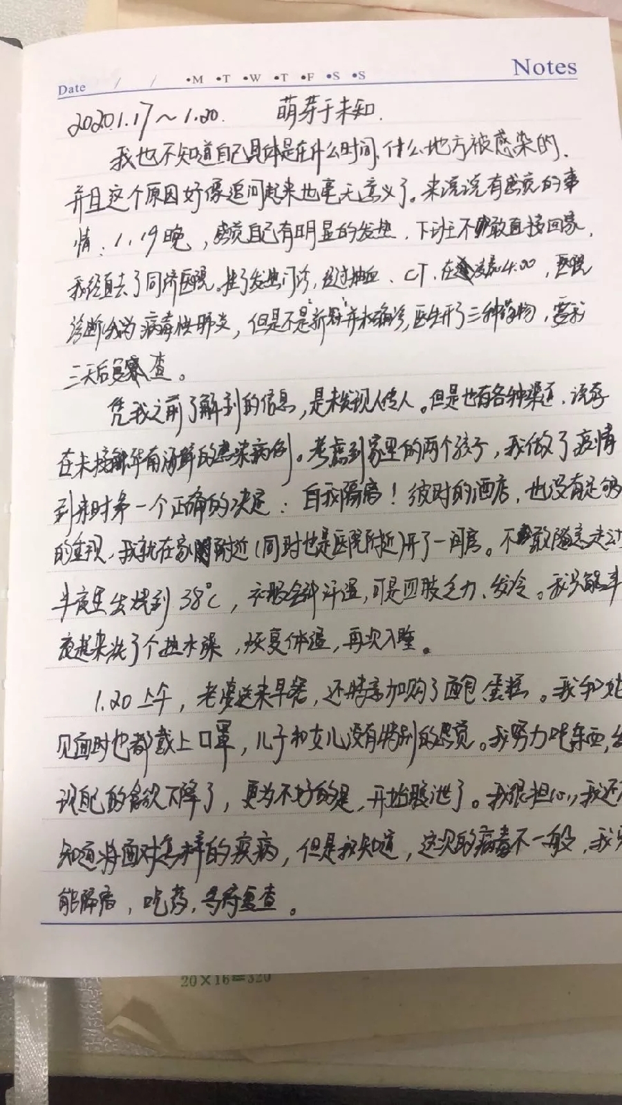 “1月20日—22日,第一次復查。食欲不振,發(fā)熱一陣一陣的,身體發(fā)虛,四肢無力,檢測結(jié)果為疑似病例,心中仍然忐忑,不知道自己的病情將走向何方。”