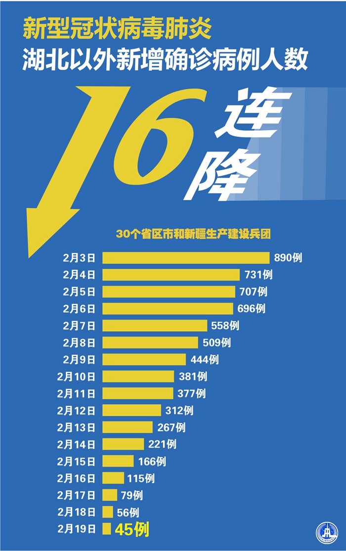 截至2月19日24時,據(jù)31個?。ㄗ灾螀^(qū)、直轄市)和新疆生產(chǎn)建設(shè)兵團報告,現(xiàn)有確診病例56303例(其中重癥病例11864例),累計治愈出院病例16155例,累計死亡病例2118例,累計報告確診病例74576例(江西、河南、云南省各核減1例),現(xiàn)有疑似病例4922例。累計追蹤到密切接觸者589163人,尚在醫(yī)學(xué)觀察的密切接觸者126363人。