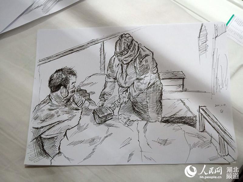 “被照顧得很好”的小彭常??吹结t(yī)護(hù)人員們穿著厚重的防護(hù)服,一忙就是6個(gè)小時(shí)以上不停歇,連水和飯都得換班以后吃,卻每天依然為患者提供無微不至的照顧。出于感動(dòng)和感激,彭昕燁向醫(yī)護(hù)人員借了紙和筆,將方艙醫(yī)院溫暖的瞬間畫成素描。