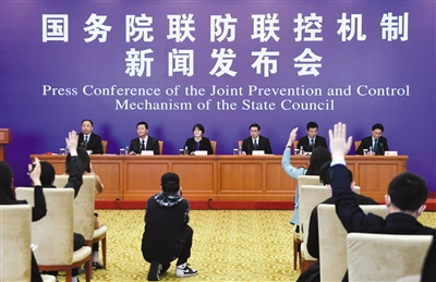 3月7日,國務院聯(lián)防聯(lián)控機制新聞發(fā)布會現場,介紹農民工返崗復工服務保障工作部署。新京報記者 吳寧 攝