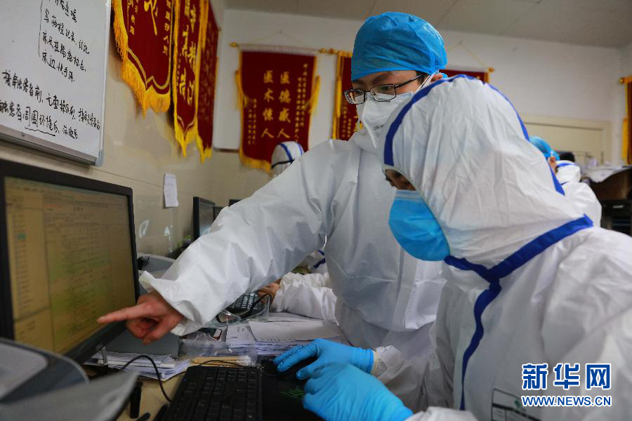 2月1日,在湖北省榮軍醫(yī)院發(fā)熱門(mén)診,醫(yī)生王琴(右一)和護(hù)士劉蕭(左二)接診發(fā)熱患者。 新華社發(fā)(劉中燦 攝)