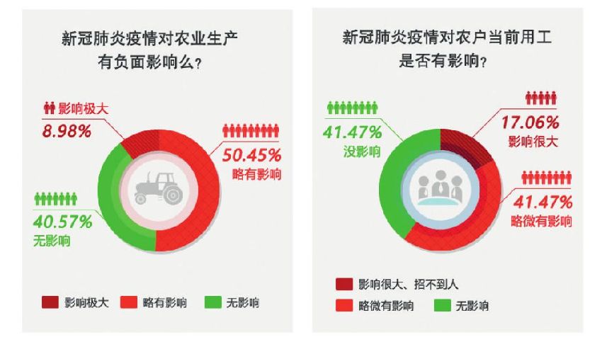 557份有效問(wèn)卷數(shù)據(jù)顯示,8.98%的農(nóng)戶認(rèn)為疫情對(duì)農(nóng)業(yè)生產(chǎn)負(fù)面影響極大,50.45%的農(nóng)戶認(rèn)為略有影響。在疫情對(duì)用工影響上,17.06%的農(nóng)戶反映影響大、招不到人,41.47%的農(nóng)戶認(rèn)為略微有影響。(見(jiàn)圖1)