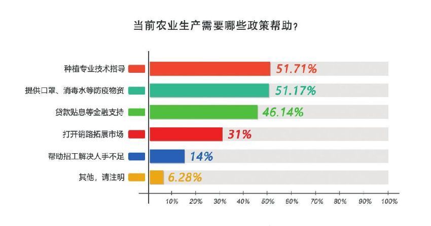 加強(qiáng)農(nóng)技指導(dǎo),給予金融支持。問(wèn)卷調(diào)查中農(nóng)戶提出多項(xiàng)政策需求,51.71%的農(nóng)戶希望得到種植專業(yè)技術(shù)指導(dǎo),51.17%的農(nóng)戶呼吁提供口罩、消毒液等防疫物資,46.14%的農(nóng)戶則希望得到貸款貼息等金融扶持。(見(jiàn)圖4)