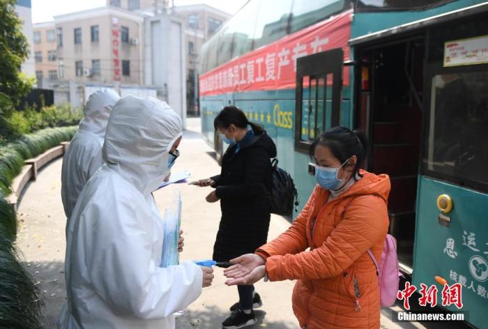 3月19日,湖北恩施復(fù)工人員到達(dá)杭州洲際食品有限公司后進(jìn)行防疫消毒。當(dāng)日,來(lái)自湖北省恩施州的首批146名赴杭州復(fù)工人員抵達(dá)浙江杭州。 中新社記者 王剛 攝