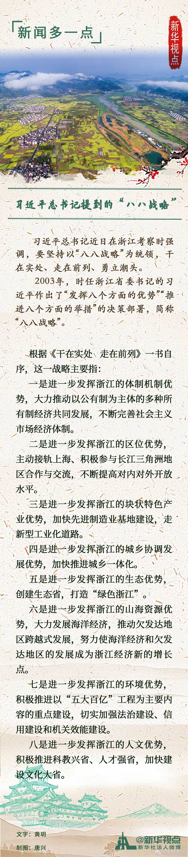 2003年,時(shí)任浙江省委書記的習(xí)近平作出了“發(fā)揮八個(gè)方面的優(yōu)勢”“推進(jìn)八個(gè)方面的舉措”的決策部署,簡稱“八八戰(zhàn)略”。