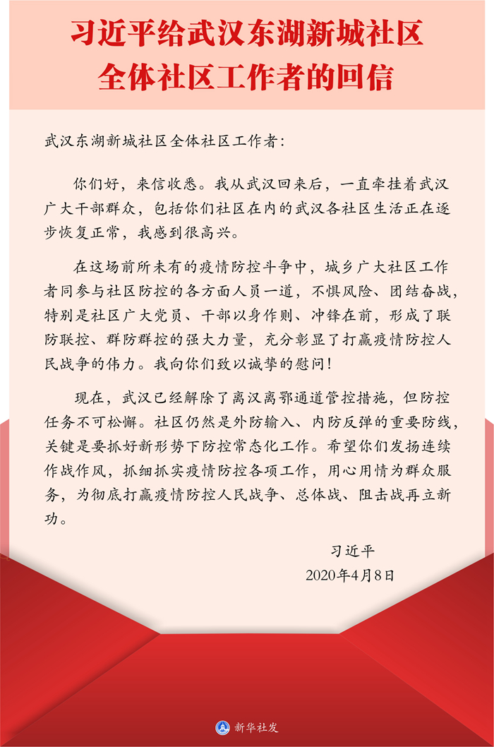 習(xí)近平給武漢東湖新城社區(qū)全體社區(qū)工作者的回信