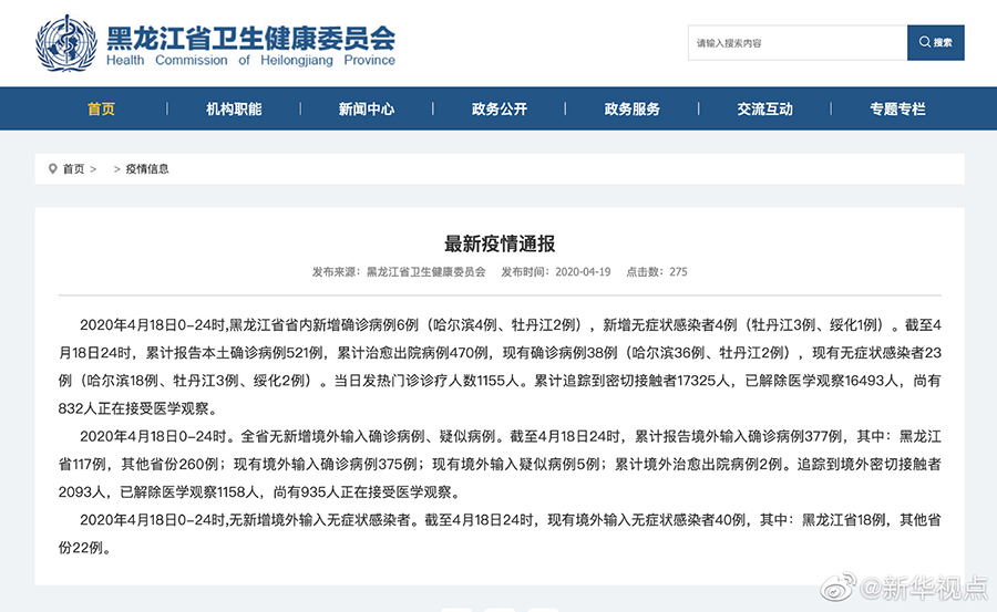 2020年4月18日0-24時(shí),黑龍江省省內(nèi)新增確診病例6例(哈爾濱4例、牡丹江2例),新增無(wú)癥狀感染者4例(牡丹江3例、綏化1例)。截至4月18日24時(shí),累計(jì)報(bào)告本土確診病例521例,累計(jì)治愈出院病例470例,現(xiàn)有確診病例38例(哈爾濱36例、牡丹江2例),現(xiàn)有無(wú)癥狀感染者23例(哈爾濱18例、牡丹江3例、綏化2例)。當(dāng)日發(fā)熱門(mén)診診療人數(shù)1155人。累計(jì)追蹤到密切接觸者17325人,已解除醫(yī)學(xué)觀察16493人,尚有832人正在接受醫(yī)學(xué)觀察。