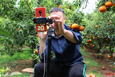 肖欽仁在自家橘子地里作直播??劉成夢 攝