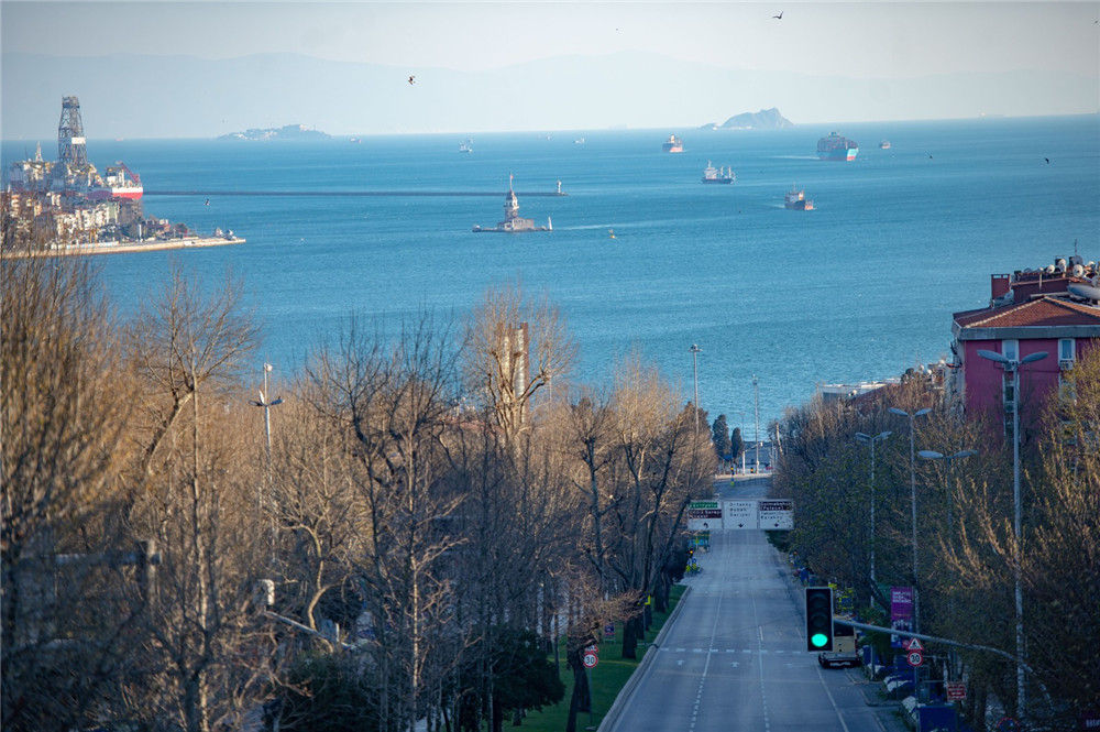 4月12日,在土耳其最大城市伊斯坦布爾,遠眺博斯普魯斯海峽中的浪漫地標少女塔,附近因?qū)嵤熬蛹伊睢倍僳E寥寥。新華社發(fā)(雅辛攝)