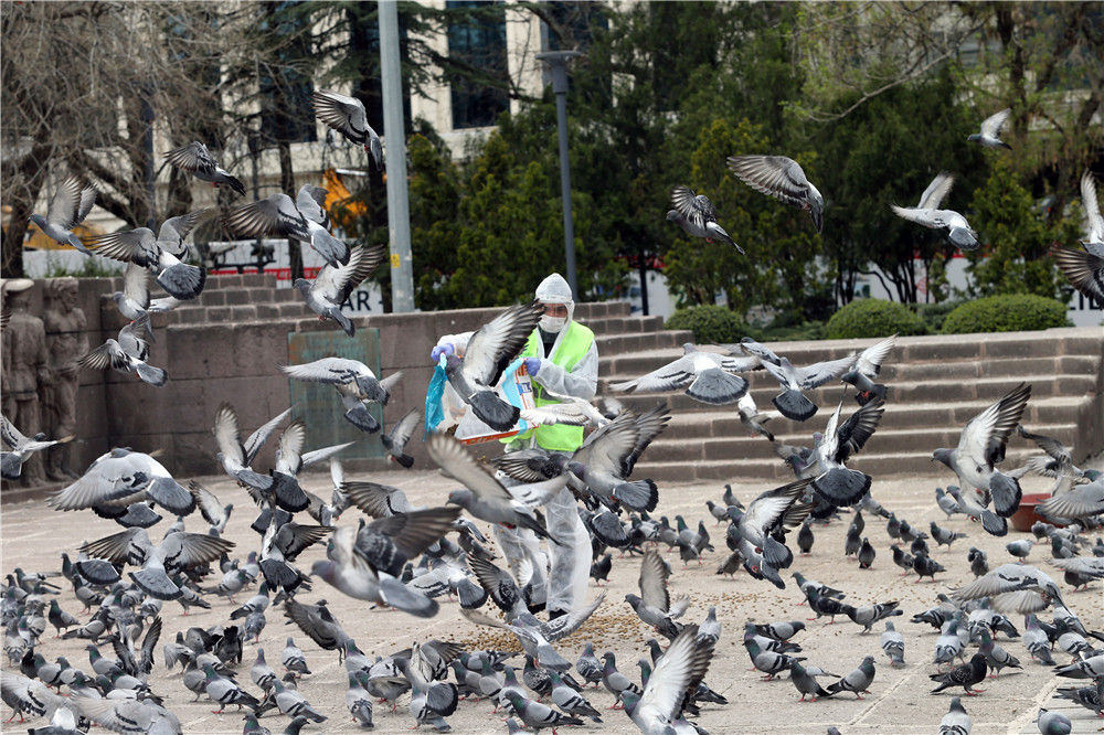 4月11日,土耳其首都、第二大城市安卡拉首度實施周末“居家令”時,政府工作人員給鴿子喂食 。新華社發(fā)(穆斯塔法·卡亞攝)