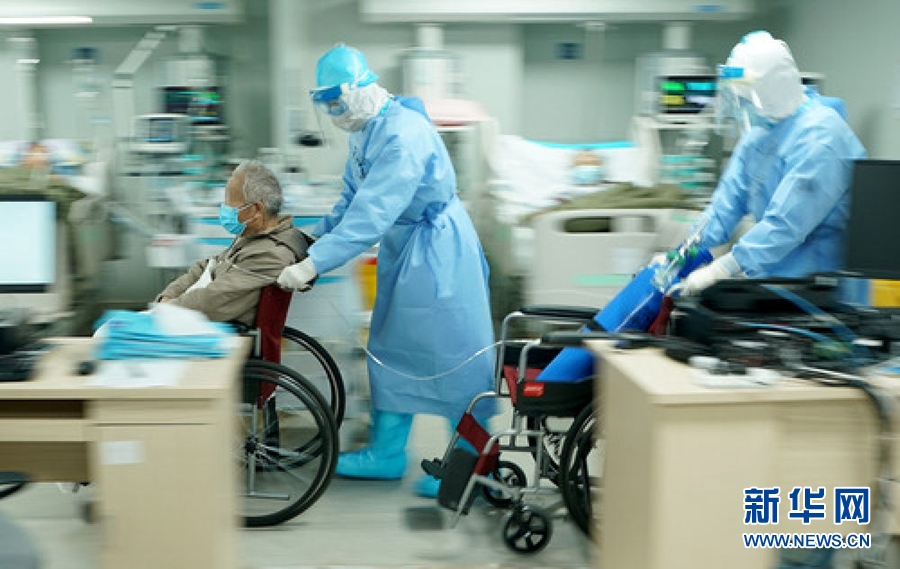 4月12日,北京協(xié)和醫(yī)院醫(yī)療隊(duì)隊(duì)員與武漢同濟(jì)醫(yī)院醫(yī)務(wù)人員共同將一名新冠肺炎危重癥患者轉(zhuǎn)往武漢同濟(jì)醫(yī)院中法新城院區(qū)ICU。在轉(zhuǎn)運(yùn)過(guò)程中,ECMO(人工膜肺)治療仍在持續(xù)進(jìn)行。?新華社記者 沈伯韓 攝