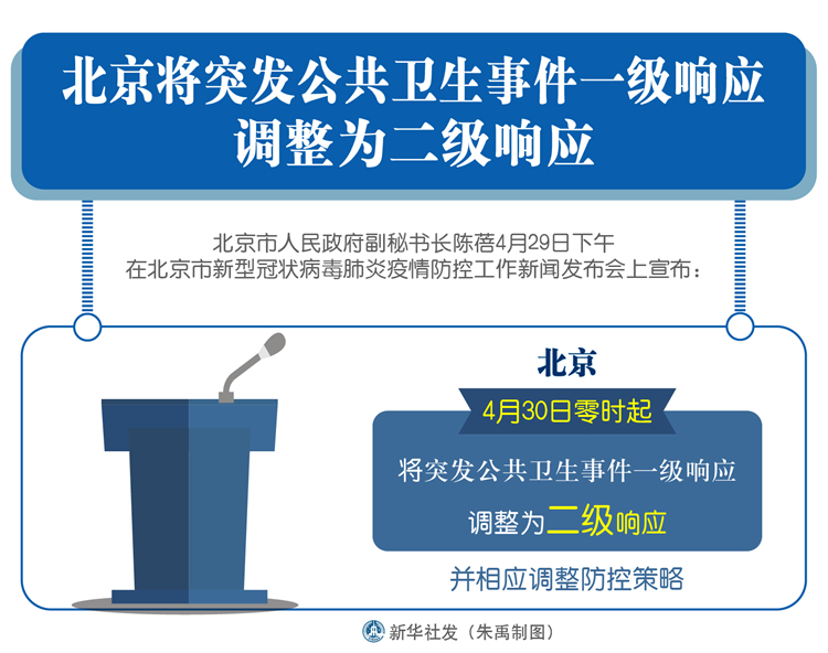 新華社北京4月29日電(記者關(guān)桂峰)北京市人民政府副秘書長(zhǎng)陳蓓29日下午在北京市新型冠狀病毒肺炎疫情防控工作新聞發(fā)布會(huì)上宣布:4月30日零時(shí)起,北京將突發(fā)公共衛(wèi)生事件一級(jí)響應(yīng)調(diào)整為二級(jí)響應(yīng),并相應(yīng)調(diào)整防控策略。