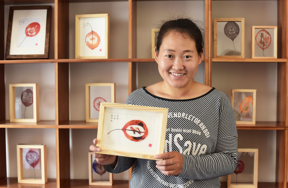 重慶市巫山縣雙龍鎮(zhèn)安靜村村民劉忠梅在紅葉藝術(shù)品加工工坊內(nèi)展示紅葉產(chǎn)品(5月26日攝)。新華社記者 王全超 攝