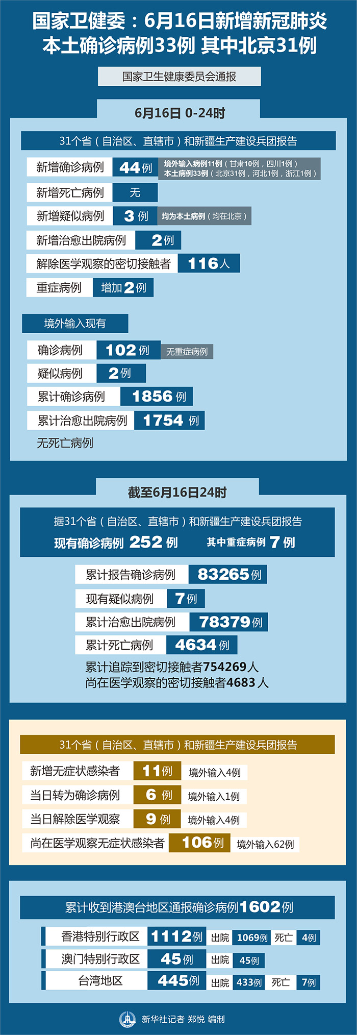 截至6月16日24時,據(jù)31個?。ㄗ灾螀^(qū)、直轄市)和新疆生產(chǎn)建設(shè)兵團(tuán)報告,現(xiàn)有確診病例252例(其中重癥病例7例),累計治愈出院病例78379例,累計死亡病例4634例,累計報告確診病例83265例,現(xiàn)有疑似病例7例。累計追蹤到密切接觸者754269人,尚在醫(yī)學(xué)觀察的密切接觸者4683人。