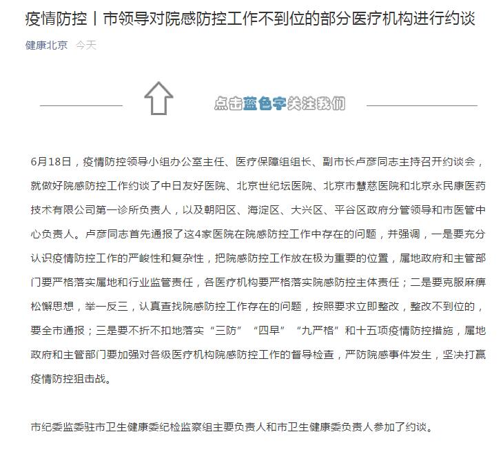 據(jù)北京市衛(wèi)健委微信公眾號(hào)消息,6月18日,疫情防控領(lǐng)導(dǎo)小組辦公室主任、醫(yī)療保障組組長、副市長盧彥同志主持召開約談會(huì),就做好院感防控工作約談了中日友好醫(yī)院、北京世紀(jì)壇醫(yī)院、北京市慧慈醫(yī)院和北京永民康醫(yī)藥技術(shù)有限公司第一診所負(fù)責(zé)人,以及朝陽區(qū)、海淀區(qū)、大興區(qū)、平谷區(qū)政府分管領(lǐng)導(dǎo)和市醫(yī)管中心負(fù)責(zé)人。