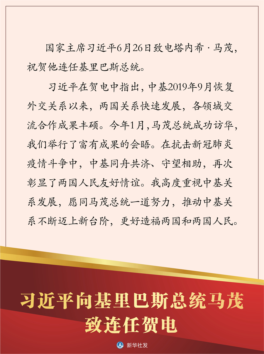 習(xí)近平在賀電中指出,中基2019年9月恢復(fù)外交關(guān)系以來,兩國(guó)關(guān)系快速發(fā)展,各領(lǐng)域交流合作成果豐碩。今年1月,馬茂總統(tǒng)成功訪華,我們舉行了富有成果的會(huì)晤。在抗擊新冠肺炎疫情斗爭(zhēng)中,中基同舟共濟(jì)、守望相助,再次彰顯了兩國(guó)人民友好情誼。我高度重視中基關(guān)系發(fā)展,愿同馬茂總統(tǒng)一道努力,推動(dòng)中基關(guān)系不斷邁上新臺(tái)階,更好造福兩國(guó)和兩國(guó)人民。