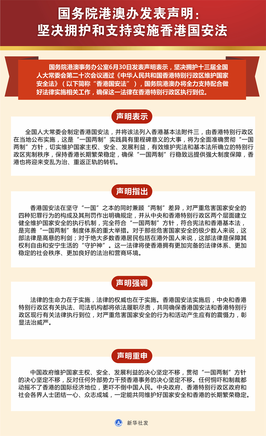 新華社北京6月30日電 國(guó)務(wù)院港澳事務(wù)辦公室30日發(fā)表聲明表示,堅(jiān)決擁護(hù)十三屆全國(guó)人大常委會(huì)第二十次會(huì)議通過(guò)《中華人民共和國(guó)香港特別行政區(qū)維護(hù)國(guó)家安全法》(以下簡(jiǎn)稱“香港國(guó)安法”),國(guó)務(wù)院港澳辦將全力支持配合做好法律實(shí)施相關(guān)工作,確保這一法律在香港特別行政區(qū)執(zhí)行到位。