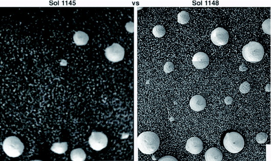 在巖層頂部的這些“生命”是集體定向的,帽子和莖向上傾斜,像沖著某個(gè)光源進(jìn)行光合作用。此外,“機(jī)遇號(hào)”還拍到了在無(wú)風(fēng)情況下,12個(gè)球形“生命”冒出土壤,另外11個(gè)“生命”在三天內(nèi)明顯長(zhǎng)大的照片。