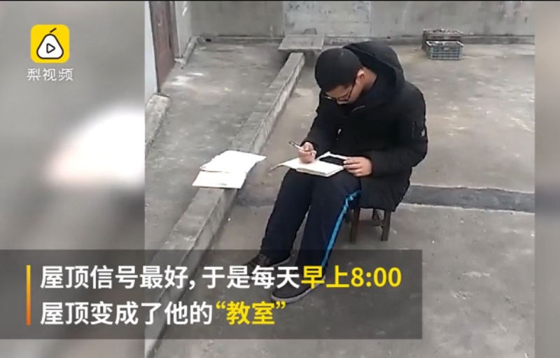 特殊時期,學校選擇了網上開課。小通因家中沒有WiFi,又舍不得用流量,就向鄰居求助,蹭隔壁家的WIFI。屋頂信號最好,于是才有了“學霸上屋頂”的勵志一幕。