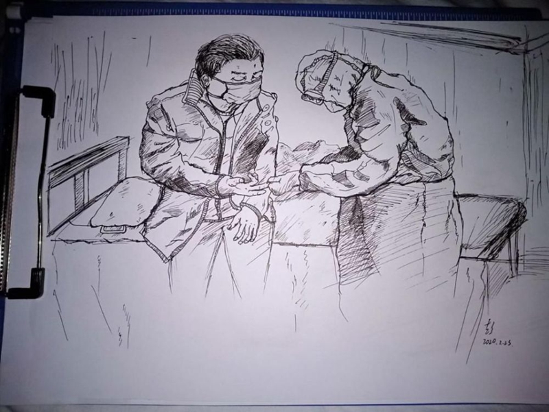 2月27日,來自貴州遵義的援鄂醫(yī)療隊護士長李蘭收到了患者送給她的一份珍貴禮物——一幅素描畫。畫中的李蘭正在悉心照顧病患,穿著防護服的身影,充滿著溫暖的力量……