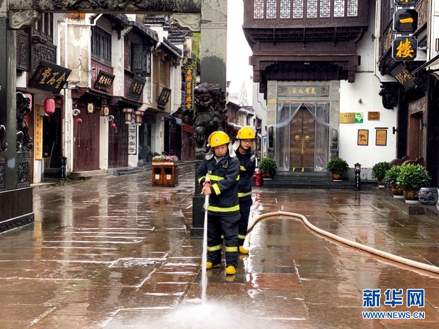 8日上午,屯溪老街正安排清理淤泥雜物,清洗消殺街道,力爭早日恢復(fù)正常。(黃山市屯溪老街街道辦事處提供)