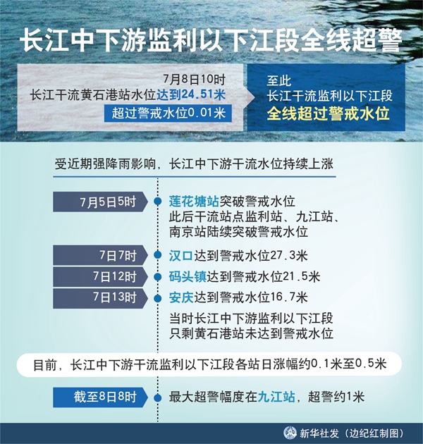新華社武漢7月8日電(記者李思遠(yuǎn)、樂文婉)8日10時,長江干流黃石港站水位達(dá)到24.51米,超過警戒水位0.01米。至此,長江干流監(jiān)利以下江段全線超過警戒水位。