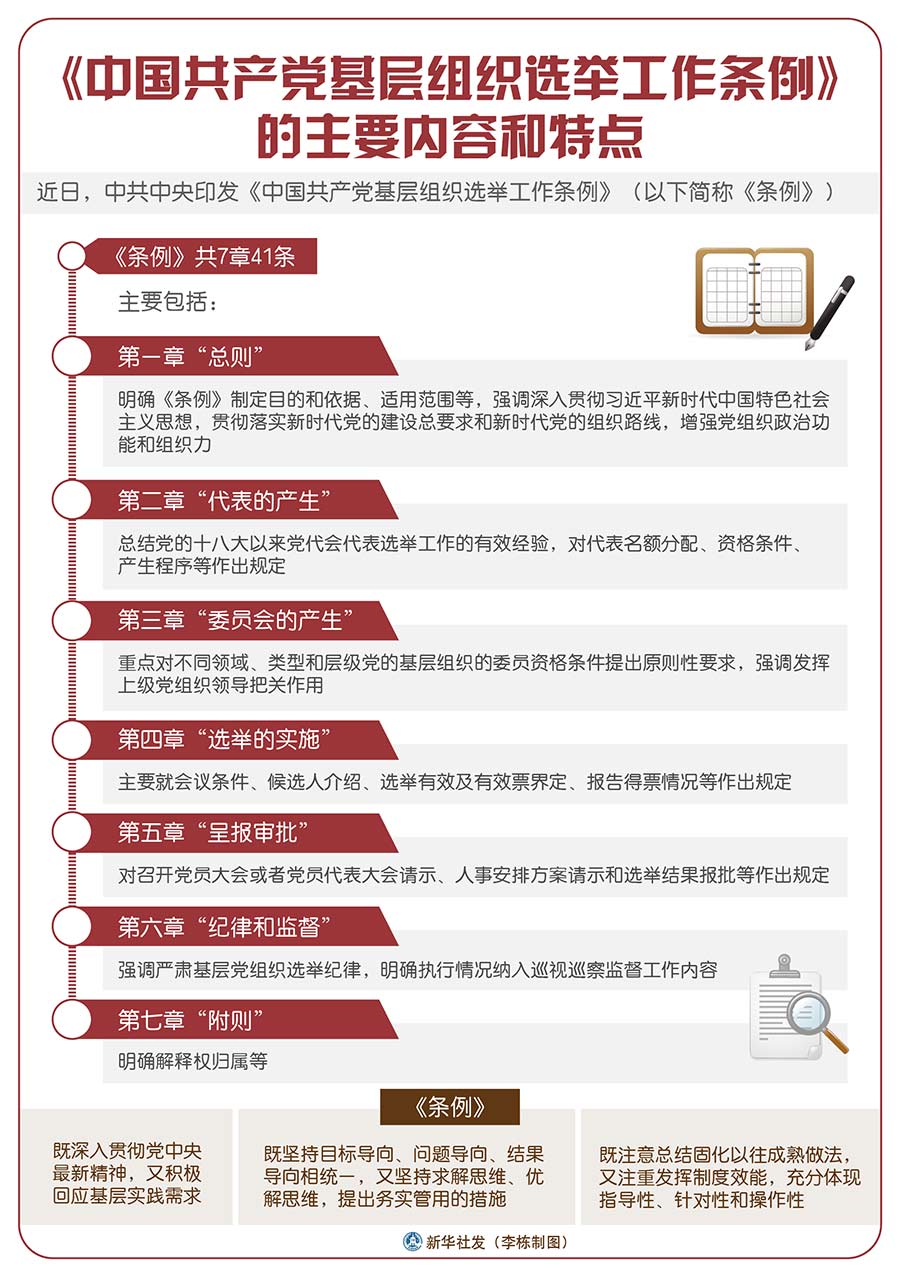 答:《條例》共7章41條,主要包括:第一章“總則”,明確《條例》制定目的和依據(jù)、適用范圍等,強(qiáng)調(diào)深入貫徹習(xí)近平新時(shí)代中國特色社會(huì)主義思想,貫徹落實(shí)新時(shí)代黨的建設(shè)總要求和新時(shí)代黨的組織路線,增強(qiáng)黨組織政治功能和組織力。第二章“代表的產(chǎn)生”,總結(jié)黨的十八大以來黨代會(huì)代表選舉工作的有效經(jīng)驗(yàn),對(duì)代表名額分配、資格條件、產(chǎn)生程序等作出規(guī)定。第三章“委員會(huì)的產(chǎn)生”,重點(diǎn)對(duì)不同領(lǐng)域、類型和層級(jí)黨的基層組織的委員資格條件提出原則性要求,強(qiáng)調(diào)發(fā)揮上級(jí)黨組織領(lǐng)導(dǎo)把關(guān)作用。第四章“選舉的實(shí)施”,主要就會(huì)議條件、候選人介紹、選舉有效及有效票界定、報(bào)告得票情況等作出規(guī)定。第五章“呈報(bào)審批”,對(duì)召開黨員大會(huì)或者黨員代表大會(huì)請(qǐng)示、人事安排方案請(qǐng)示和選舉結(jié)果報(bào)批等作出規(guī)定。第六章“紀(jì)律和監(jiān)督”,強(qiáng)調(diào)嚴(yán)肅基層黨組織選舉紀(jì)律,明確執(zhí)行情況納入巡視巡察監(jiān)督工作內(nèi)容。第七章“附則”,明確解釋權(quán)歸屬等。