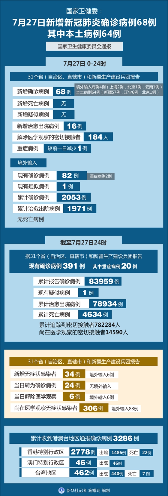 新華社北京7月28日電 國(guó)家衛(wèi)生健康委員會(huì)28日通報(bào),7月27日0—24時(shí),31個(gè)?。ㄗ灾螀^(qū)、直轄市)和新疆生產(chǎn)建設(shè)兵團(tuán)報(bào)告新增新冠肺炎確診病例68例,其中境外輸入病例4例(上海2例,北京1例,云南1例),本土病例64例(新疆57例,遼寧6例,北京1例);無(wú)新增死亡病例;無(wú)新增疑似病例。