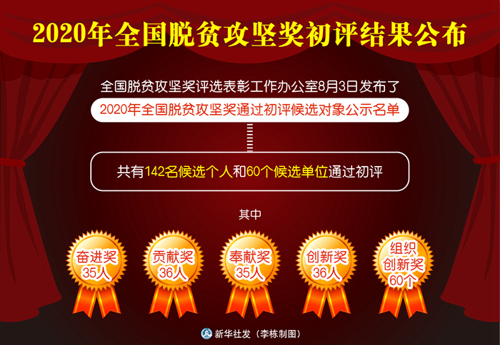 新華社北京8月3日電(記者侯雪靜)全國脫貧攻堅獎評選表彰工作辦公室3日發(fā)布了2020年全國脫貧攻堅獎通過初評候選對象公示名單,共有142名候選個人和60個候選單位通過初評,其中奮進獎有35人,貢獻獎36人,奉獻獎35人,創(chuàng)新獎36人,組織創(chuàng)新獎60個。