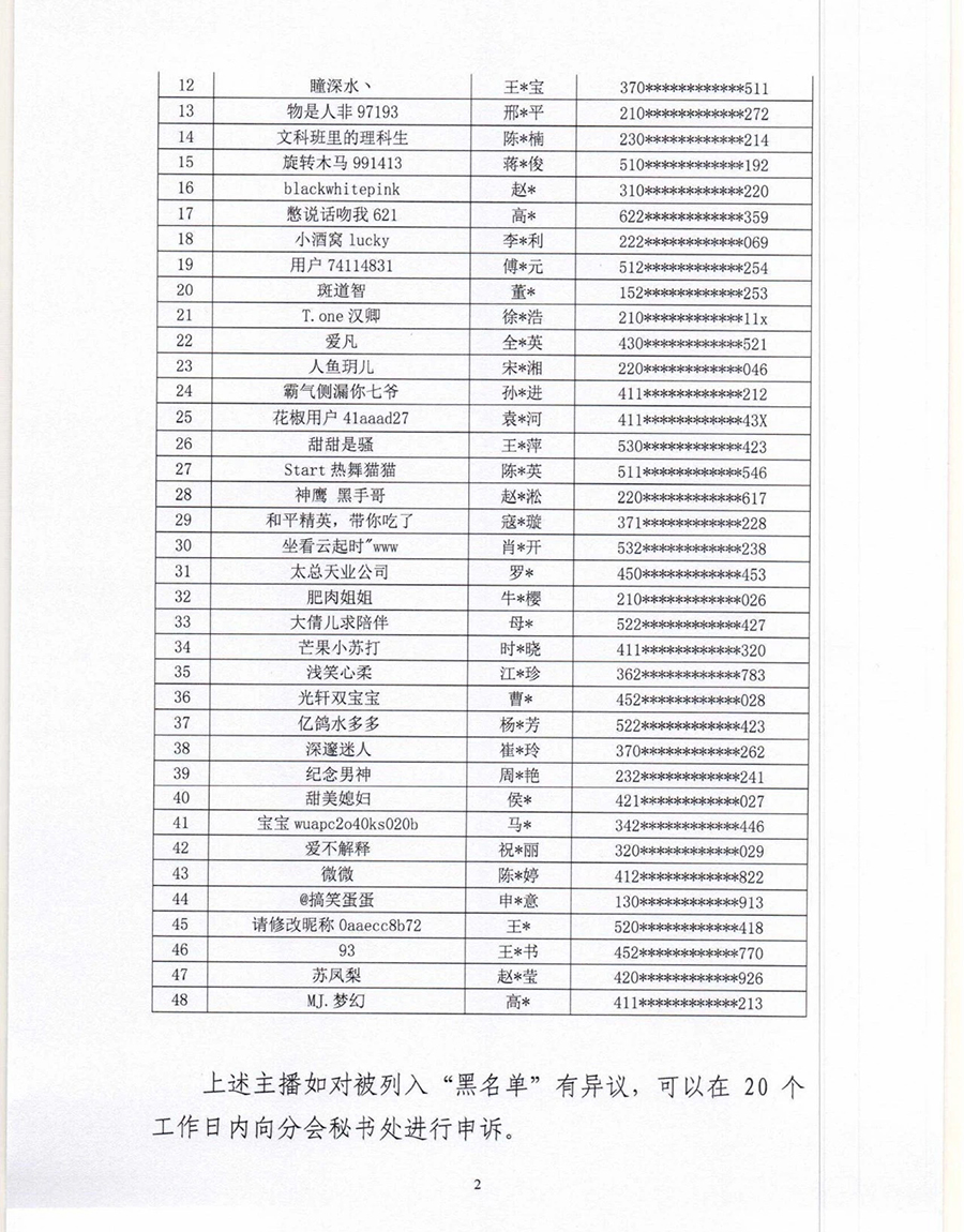 根據(jù)《互聯(lián)網(wǎng)文化管理暫行規(guī)定》《網(wǎng)絡(luò)表演經(jīng)營(yíng)活動(dòng)管理辦法》《互聯(lián)網(wǎng)直播服務(wù)管理規(guī)定》等相關(guān)法律法規(guī),按照《網(wǎng)絡(luò)表演(直播)行業(yè)主播“黑名單”管理制度》《黑名單認(rèn)定工作流程》規(guī)定,中國(guó)演出行業(yè)協(xié)會(huì)網(wǎng)絡(luò)表演(直播)分會(huì)現(xiàn)向社會(huì)公布第六批主播黑名單,被列入黑名單的主播將在行業(yè)內(nèi)禁止注冊(cè)和直播,封禁期限5年。(總臺(tái)央視記者 曹巖)