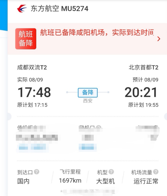 9日傍晚備降西安的東航MU5274次航班上的乘客已更換飛機,于9日21:43,從西安咸陽國際機場起飛前往目的地北京。
