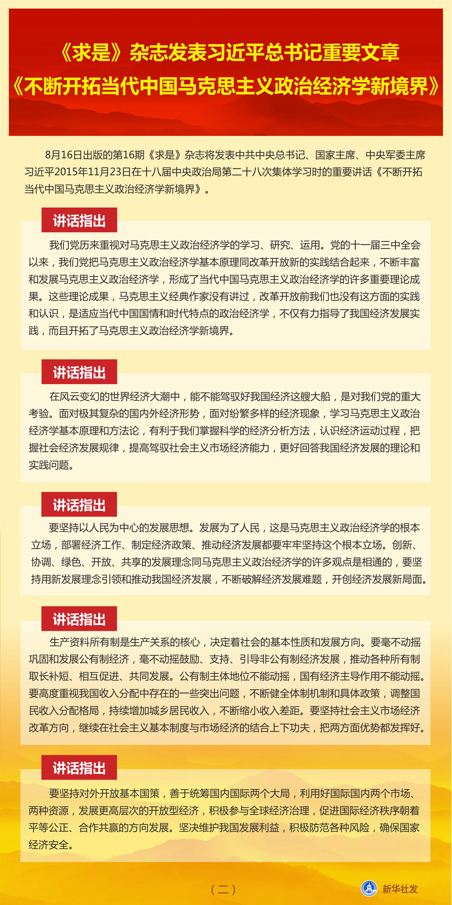講話指出,我們黨歷來重視對(duì)馬克思主義政治經(jīng)濟(jì)學(xué)的學(xué)習(xí)、研究、運(yùn)用。黨的十一屆三中全會(huì)以來,我們黨把馬克思主義政治經(jīng)濟(jì)學(xué)基本原理同改革開放新的實(shí)踐結(jié)合起來,不斷豐富和發(fā)展馬克思主義政治經(jīng)濟(jì)學(xué),形成了當(dāng)代中國馬克思主義政治經(jīng)濟(jì)學(xué)的許多重要理論成果。這些理論成果,馬克思主義經(jīng)典作家沒有講過,改革開放前我們也沒有這方面的實(shí)踐和認(rèn)識(shí),是適應(yīng)當(dāng)代中國國情和時(shí)代特點(diǎn)的政治經(jīng)濟(jì)學(xué),不僅有力指導(dǎo)了我國經(jīng)濟(jì)發(fā)展實(shí)踐,而且開拓了馬克思主義政治經(jīng)濟(jì)學(xué)新境界。