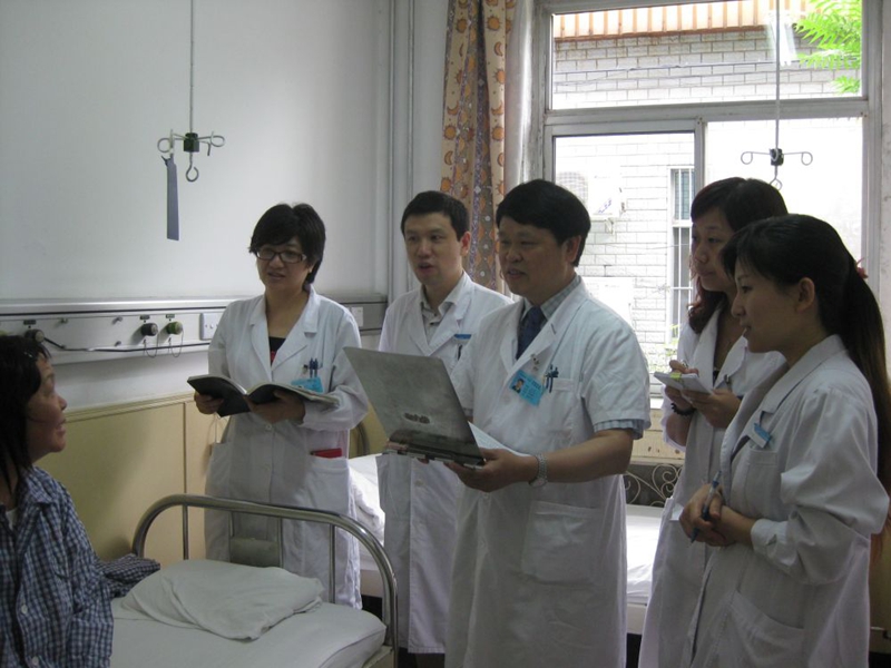 中國(guó)醫(yī)學(xué)科學(xué)院腫瘤醫(yī)院徐兵河教授(右三)、馬飛教授(右四)攜治療團(tuán)隊(duì)在病房查問(wèn)乳腺癌患者康復(fù)情況。圖片由受訪(fǎng)者提供