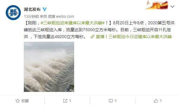 據(jù)湖北省人民政府新聞辦公室官方微博消息,三峽樞紐迎來建庫以來最大洪峰,當(dāng)日上午8點,2020第五號洪峰抵達(dá)三峽樞紐入庫,流量達(dá)到75000立方米每秒。