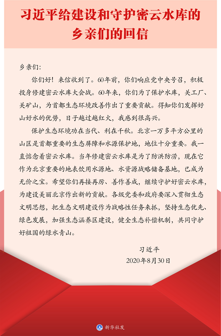 新華社北京8月31日電 習(xí)近平給建設(shè)和守護(hù)密云水庫(kù)的鄉(xiāng)親們的回信