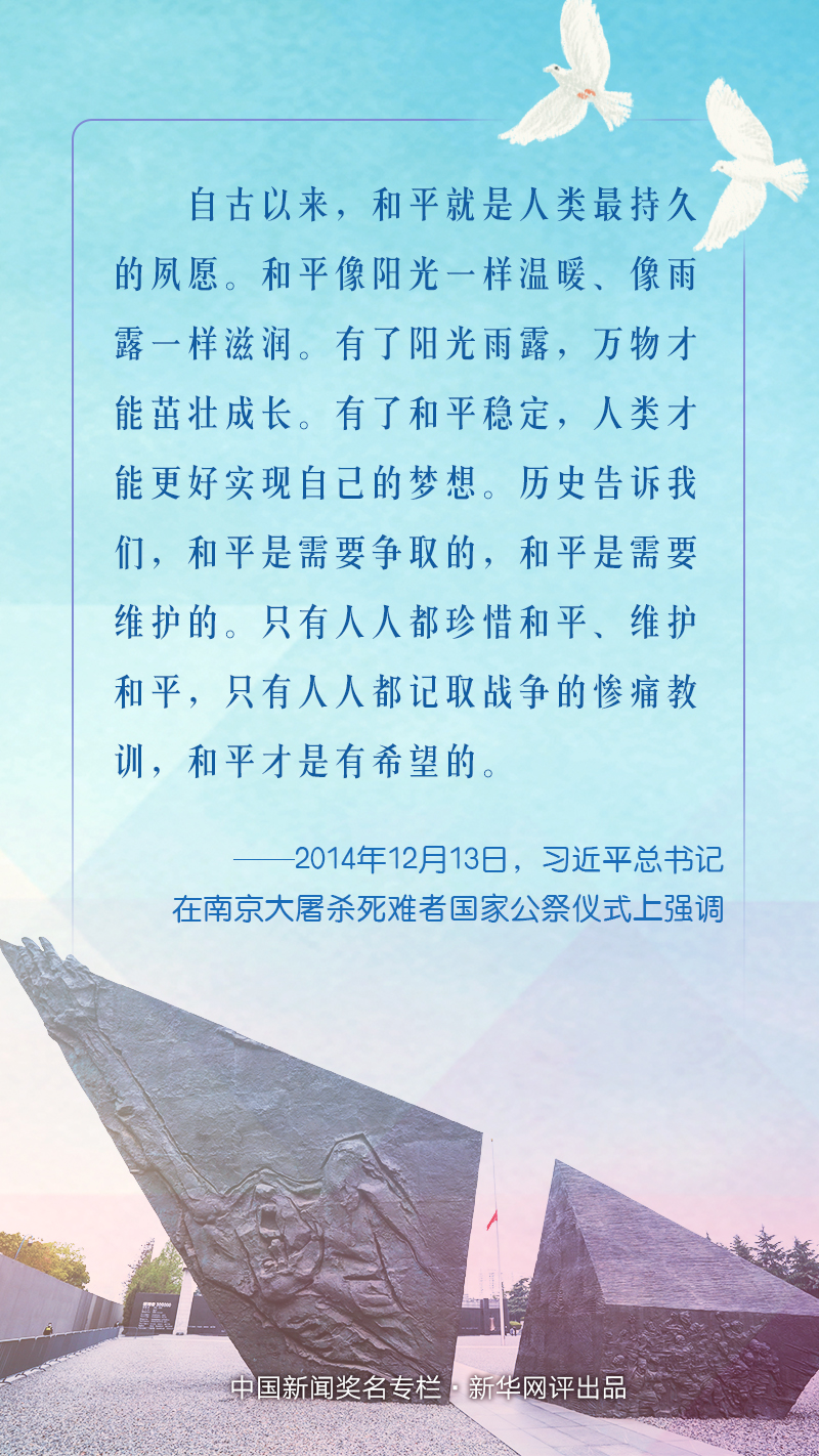 和平是人類的永恒期望。今天,和平與發(fā)展已經(jīng)成為時(shí)代主題,但世界仍很不太平,戰(zhàn)爭的達(dá)摩克利斯之劍依然懸在人類頭上。歷史告訴我們,和平需要爭取,更需要維護(hù)。只有人人都珍惜和平、維護(hù)和平,只有人人都汲取戰(zhàn)爭的慘痛教訓(xùn),和平才會更有希望。我們要以史為鑒,堅(jiān)定維護(hù)和平的決心,堅(jiān)定不移走和平發(fā)展道路,才能推動(dòng)建設(shè)持久和平、普遍安全、共同繁榮、開放包容、清潔美麗的新世界,讓和平的陽光永遠(yuǎn)普照人類生活的星球。