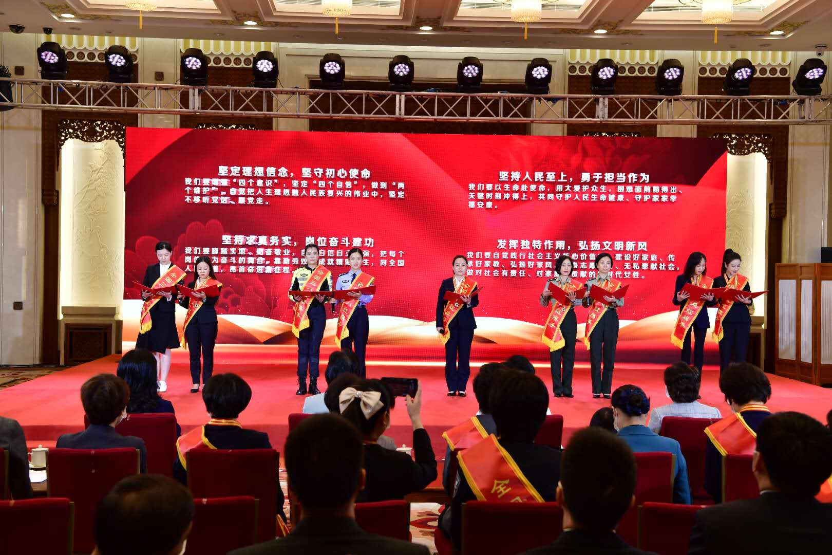 “堅(jiān)定理想信念,堅(jiān)守初心使命;堅(jiān)持人民至上,勇于擔(dān)當(dāng)作為;堅(jiān)持求真務(wù)實(shí),崗位奮斗建功;發(fā)揮獨(dú)特作用,弘揚(yáng)文明新風(fēng)?!惫鹦∶谩⒑3?、肖利、范怡婷、周艷、陶源、薇婭、劉仙、謝小玉代表受表彰的抗疫全國三八紅旗手向全國姐妹們發(fā)出倡議,更加緊密地團(tuán)結(jié)在以習(xí)近平同志為核心的黨中央周圍,弘揚(yáng)偉大抗疫精神,爭做新時(shí)代最美巾幗奮斗者,努力創(chuàng)造無愧于時(shí)代、無愧于人民、無愧于歷史的業(yè)績,為建設(shè)社會(huì)主義現(xiàn)代化強(qiáng)國、實(shí)現(xiàn)中華民族偉大復(fù)興書寫嶄新的巾幗榮光。