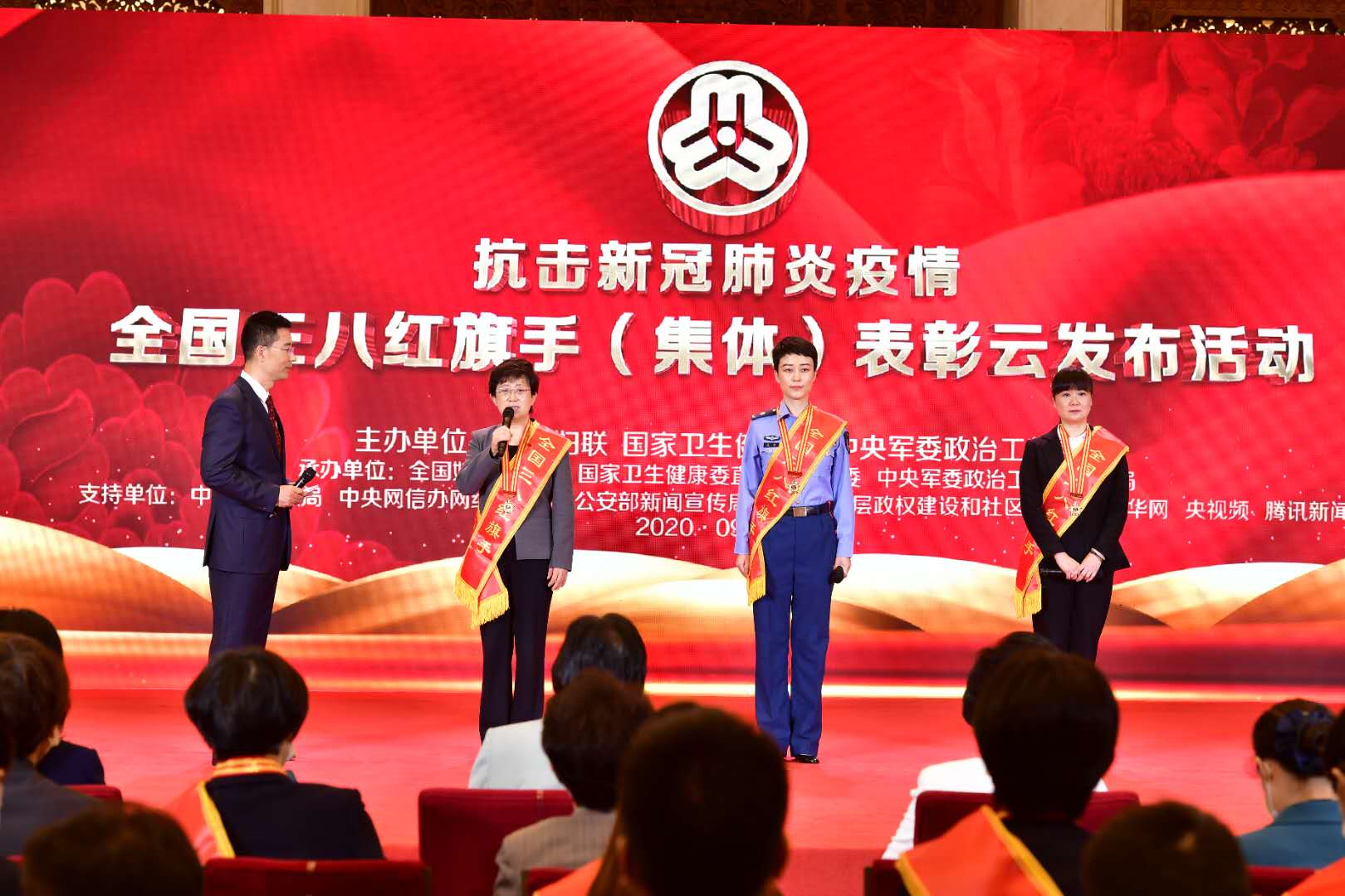活動(dòng)開始,全場肅立,向新冠肺炎疫情犧牲烈士和逝世同胞默哀?,F(xiàn)場還通過短片致敬犧牲的抗疫全國三八紅旗手英模。全國婦聯(lián)、國家衛(wèi)生健康委、中央軍委政治工作部聯(lián)合表彰鮑琳琳等500名同志和湖北省武漢市金銀潭醫(yī)院功能科等100個(gè)集體,均為敬佑生命、救死扶傷、甘于奉獻(xiàn)、大愛無疆的醫(yī)務(wù)人員;全國婦聯(lián)表彰顏葵等300名同志和北京市豐臺(tái)區(qū)新村街道風(fēng)格與林社區(qū)居委會(huì)等100個(gè)集體,都是在群防群治、聯(lián)防聯(lián)控中挺身而出的各行各業(yè)優(yōu)秀女性。
