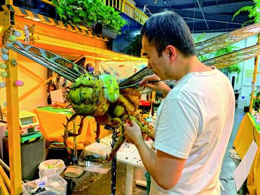 為了給人們解釋蜻蜓如何飛行覓食,寧原制作了一個放大數(shù)萬倍的彩色巨型“蜻蜓隊長”模型;為了展示蜘蛛織網(wǎng)的過程,他不僅制作了一個龐大的金色蜘蛛,還搭建了紙質(zhì)樹林立體展板,還原小蜘蛛在樹林中織網(wǎng)的場景,讓觀眾看完恍然大悟、大呼過癮。