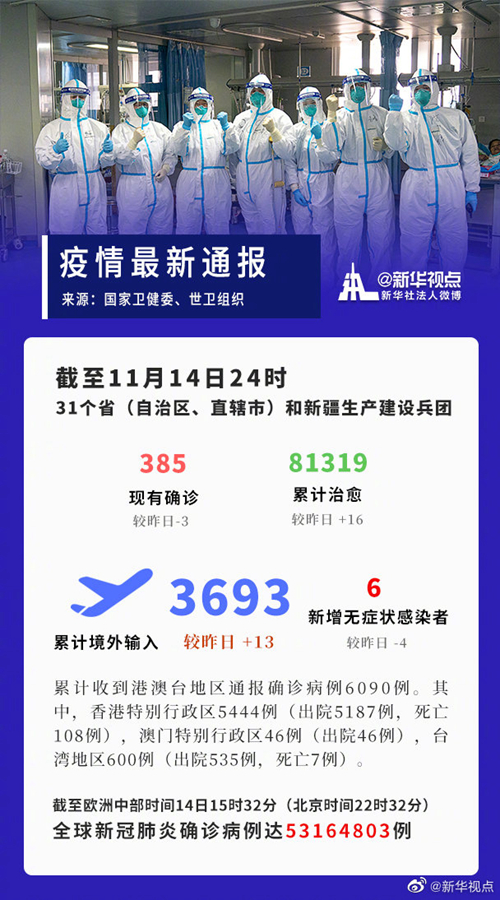 截至11月14日24時,據(jù)31個?。ㄗ灾螀^(qū)、直轄市)和新疆生產(chǎn)建設(shè)兵團(tuán)報告,現(xiàn)有確診病例385例(其中重癥病例4例),累計治愈出院病例81319例,累計死亡病例4634例,累計報告確診病例86338例,現(xiàn)有疑似病例2例。累計追蹤到密切接觸者873191人,尚在醫(yī)學(xué)觀察的密切接觸者15032人。